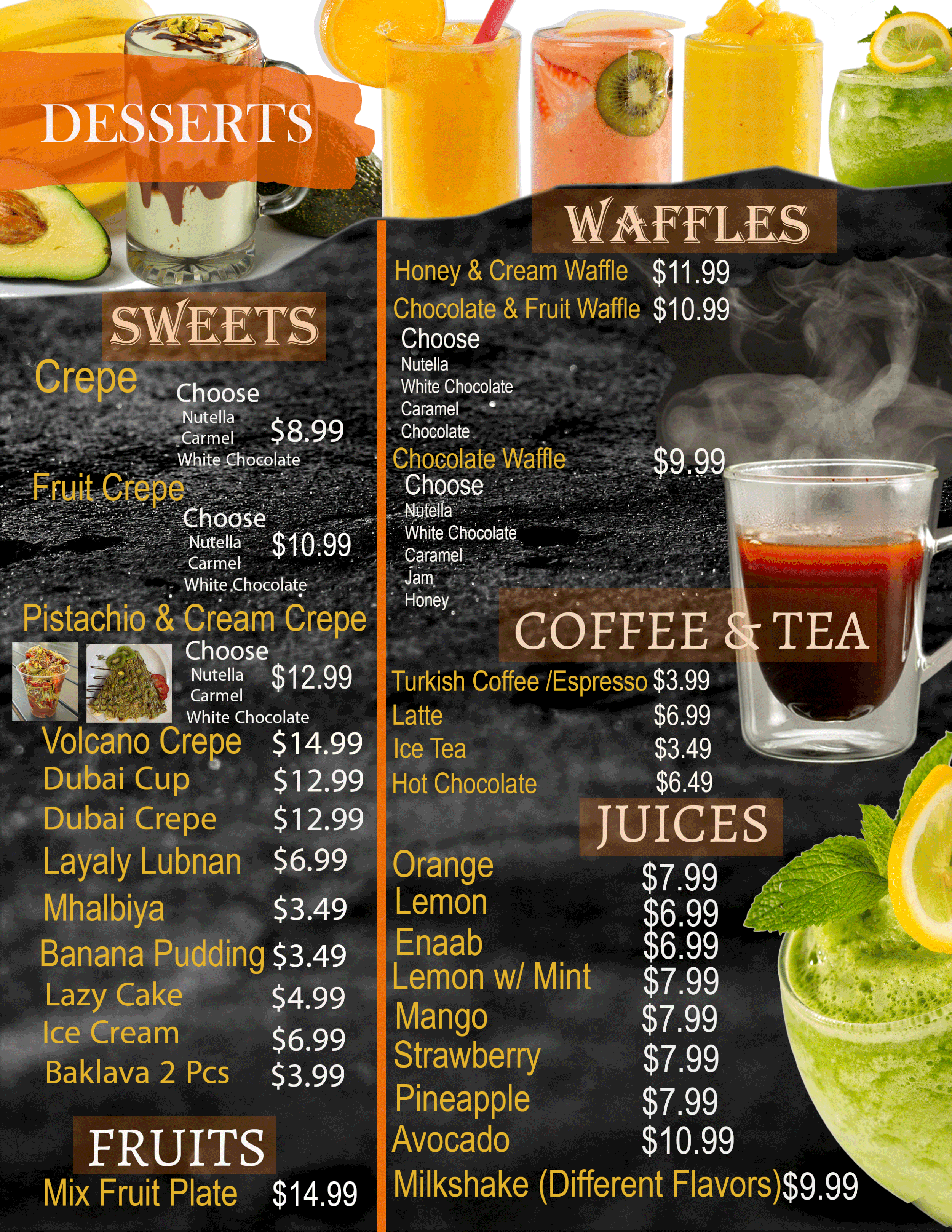 Menu featuring desserts, sweets, fruits, waffles, coffee, tea, and juices with colorful drinks and fruit pictures in the background.