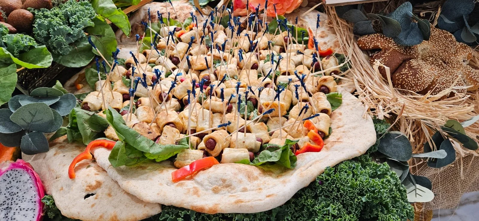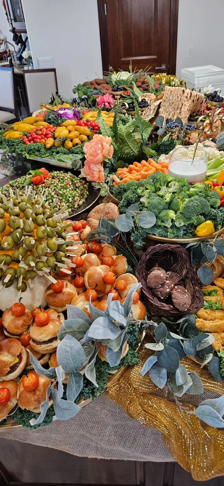 A large table with an elaborate spread of food, including salads, meatballs, a baked dish, and mini sandwiches with red toppings, all arranged decoratively with garnishes and flowers.