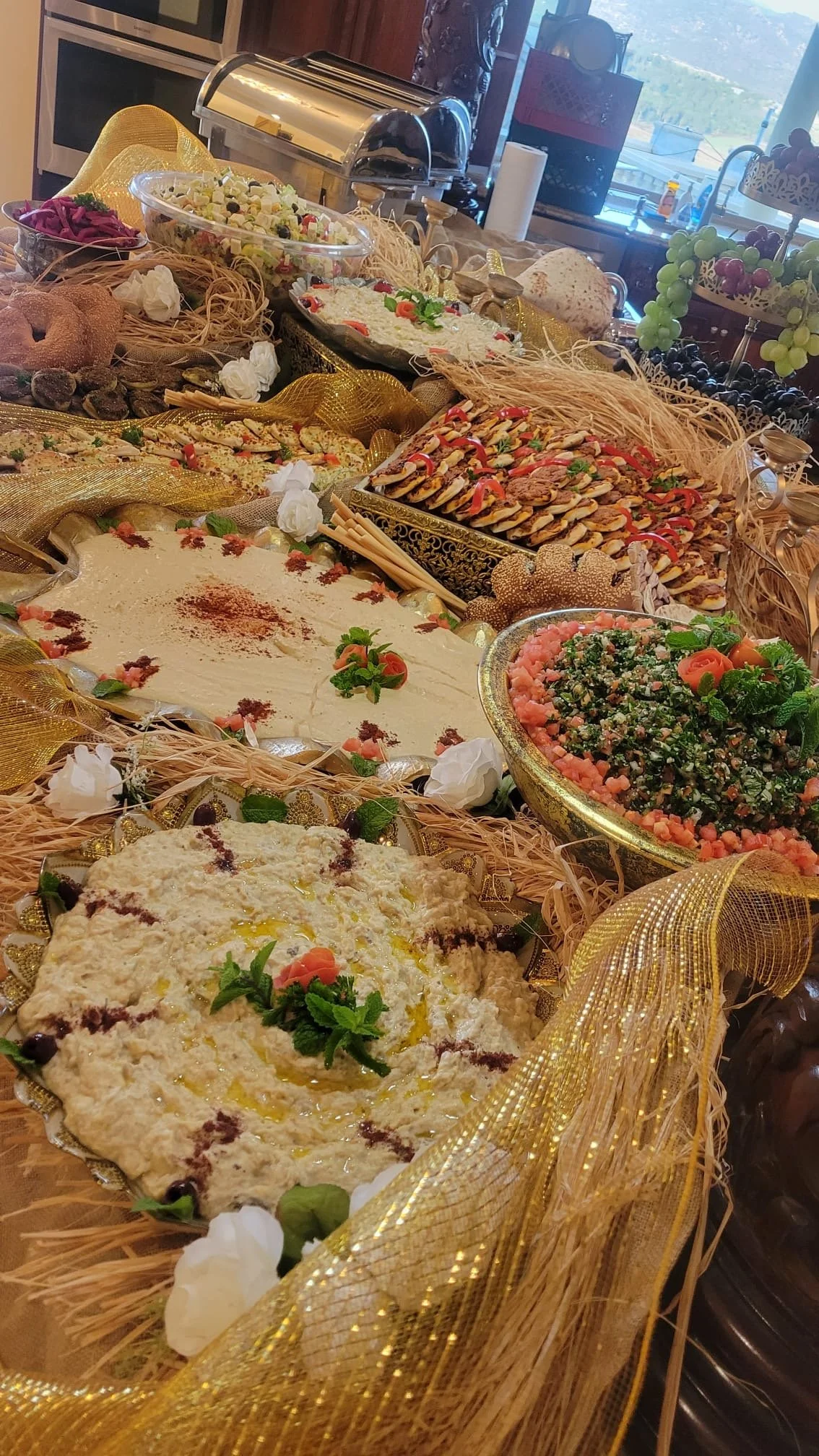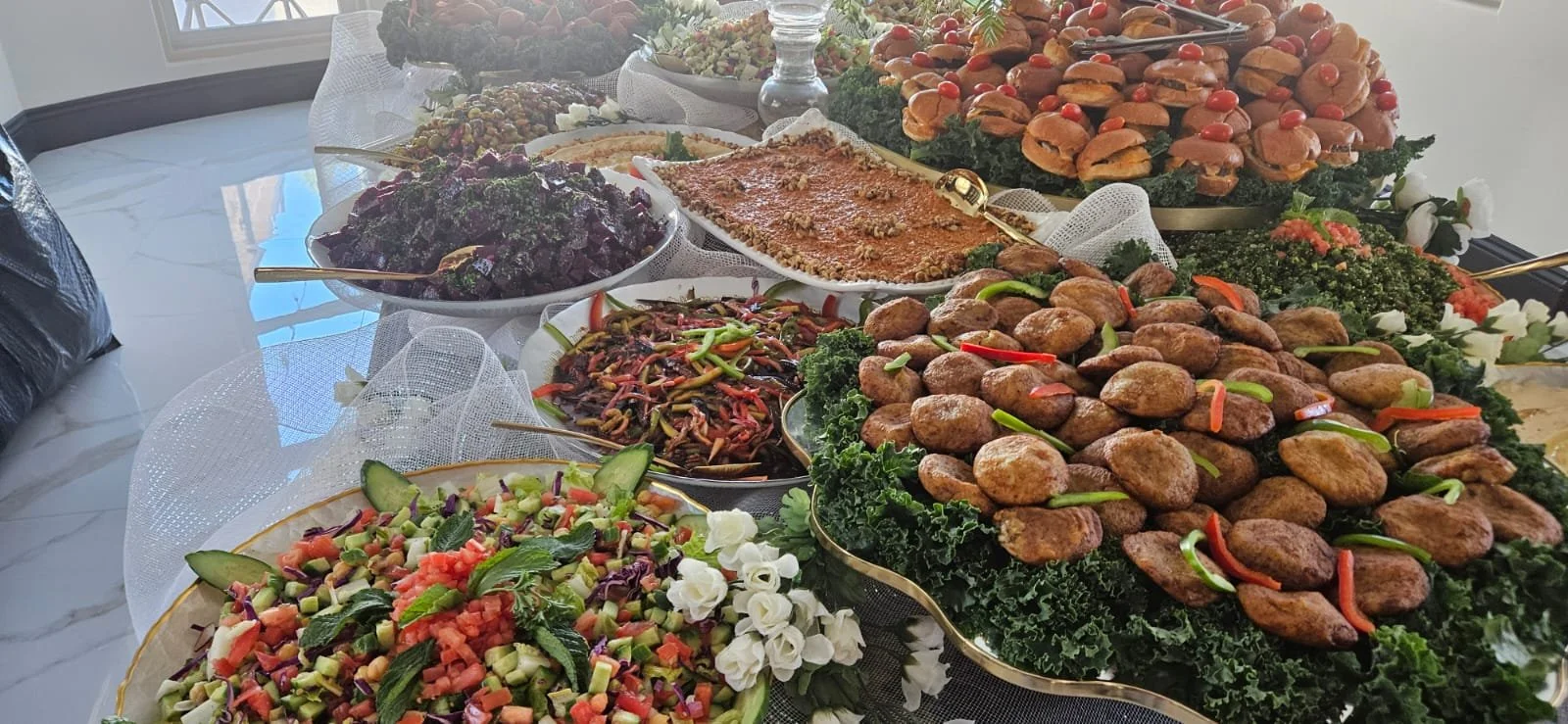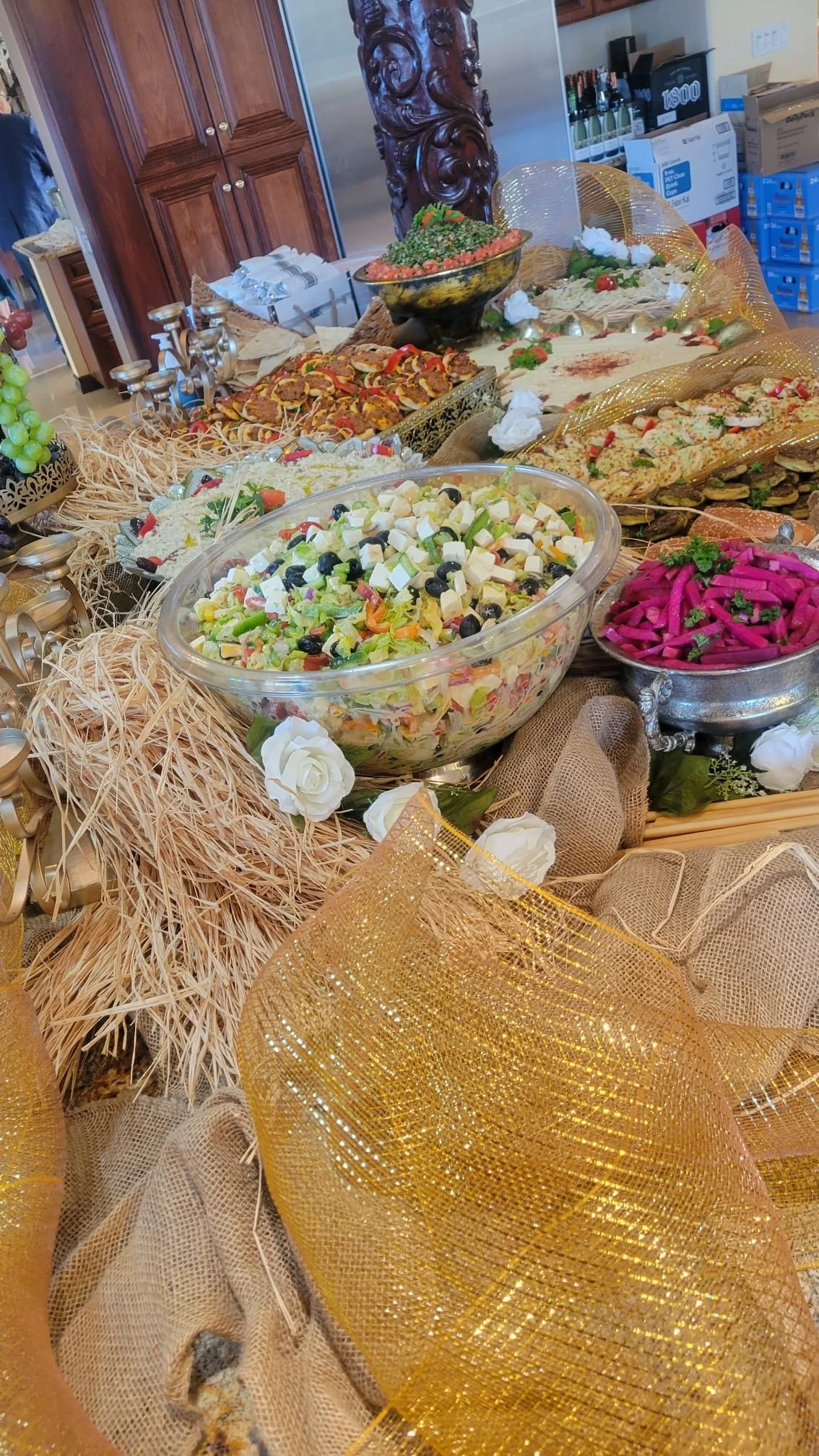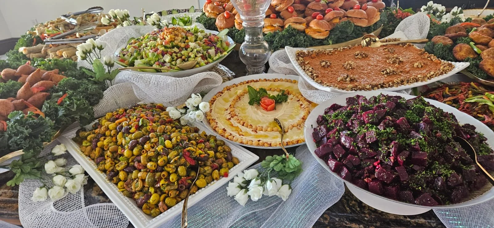 A table decorated with a variety of Middle Eastern or Mediterranean dishes, including salads, dips, and appetizers, adorned with gold ribbon and white flowers.