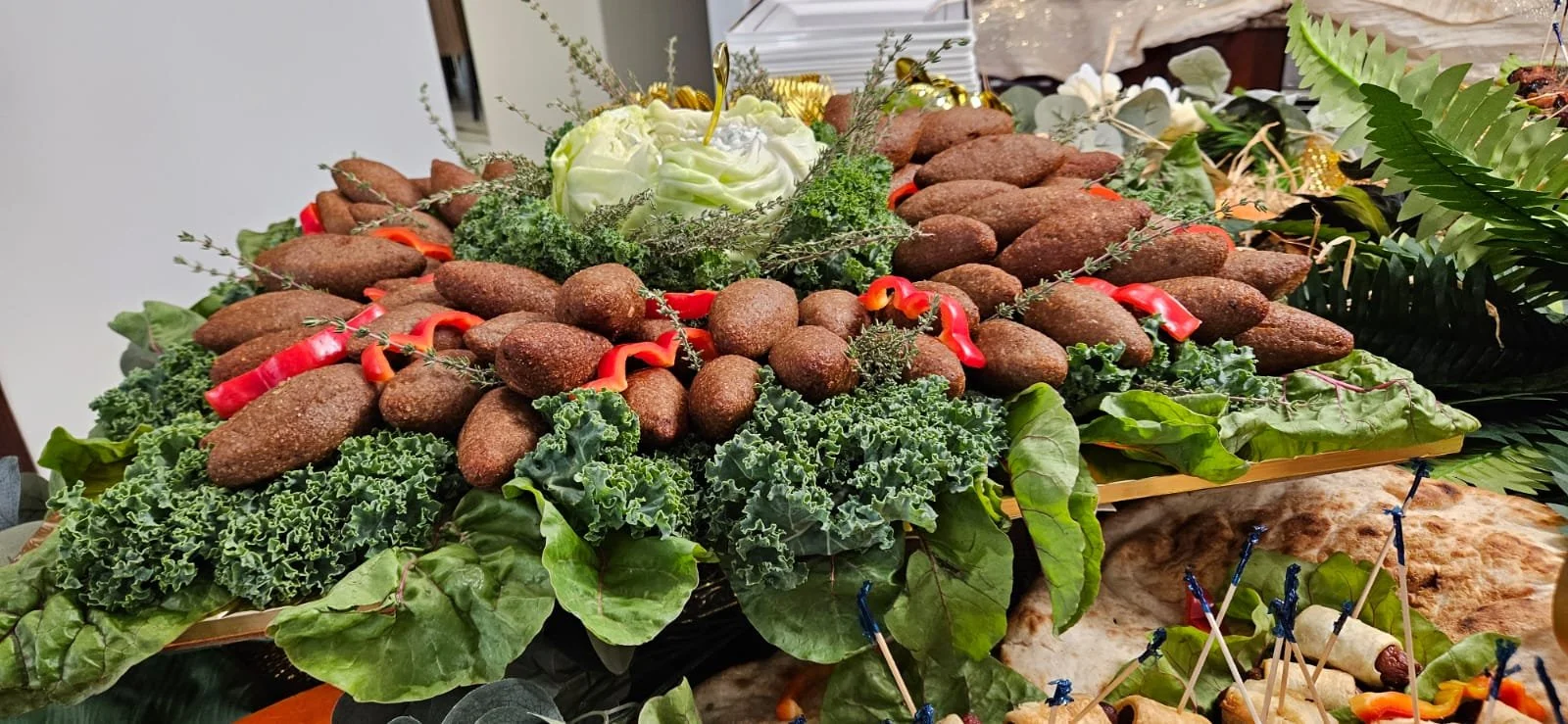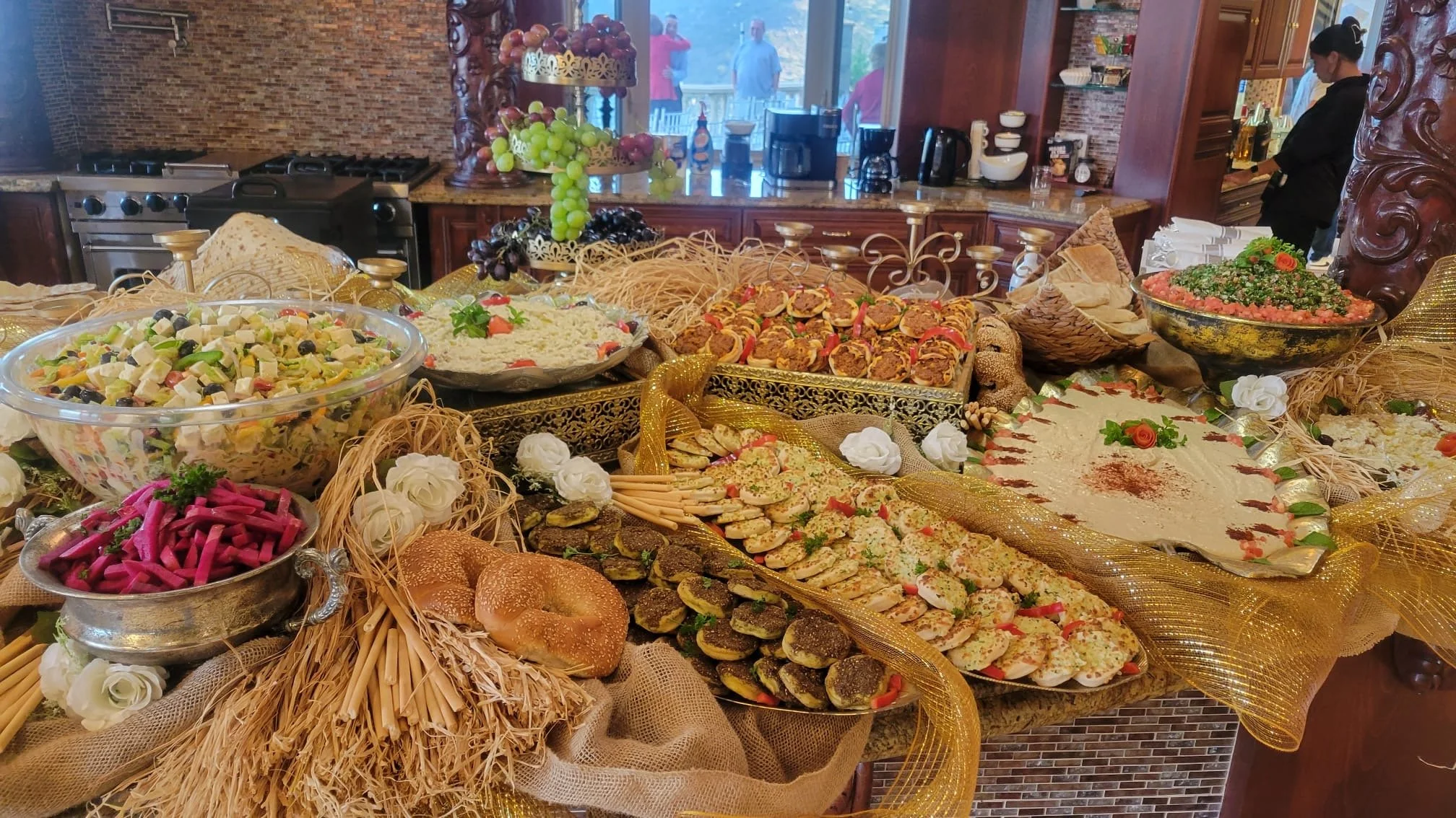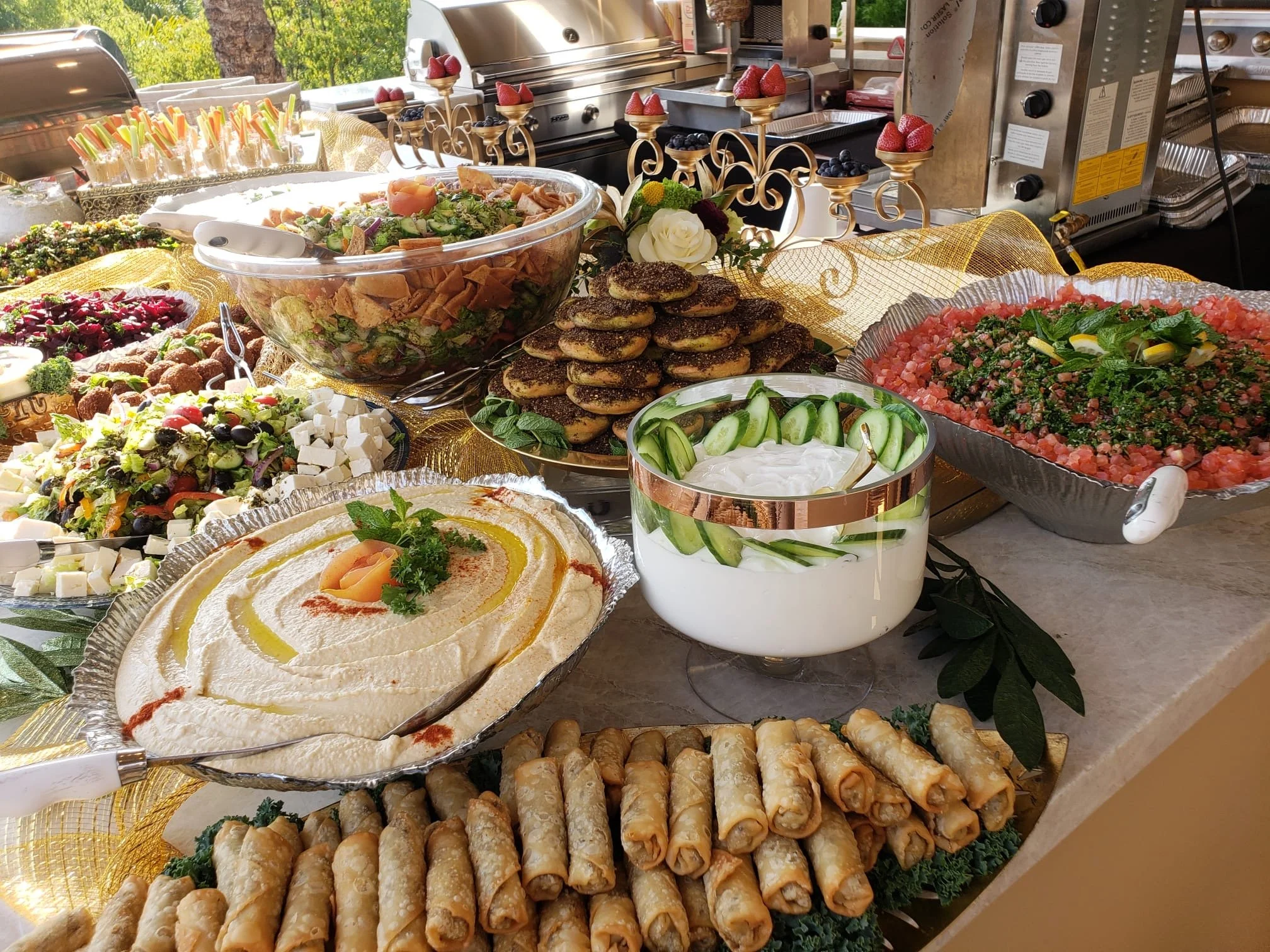 A table decorated with a variety of Middle Eastern or Mediterranean dishes, including salads, dips, and appetizers, adorned with gold ribbon and white flowers.