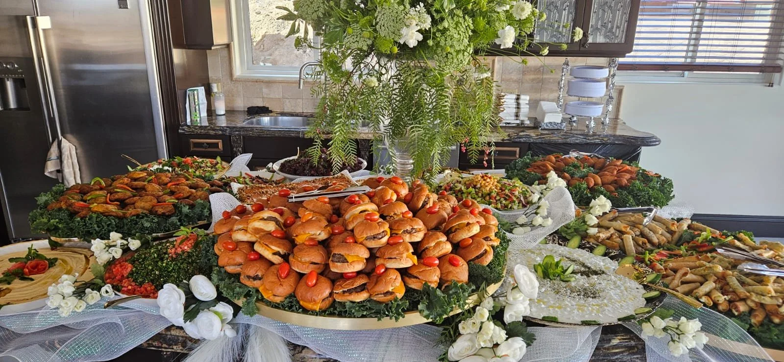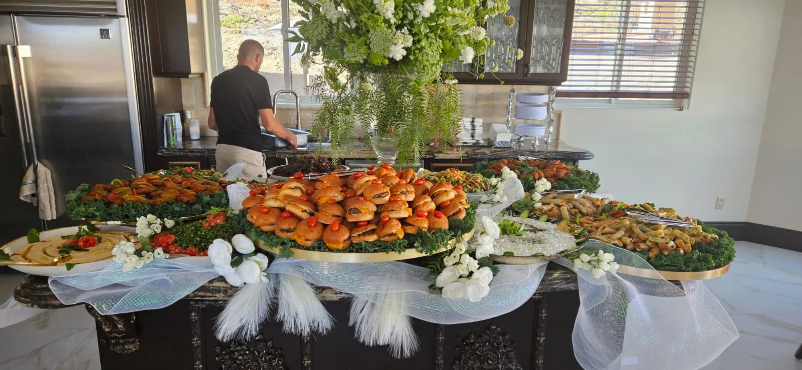 A buffet table with an assortment of sliders, finger foods, and appetizers decorated with white flowers, greenery, and tulle, with a person preparing food in the background.