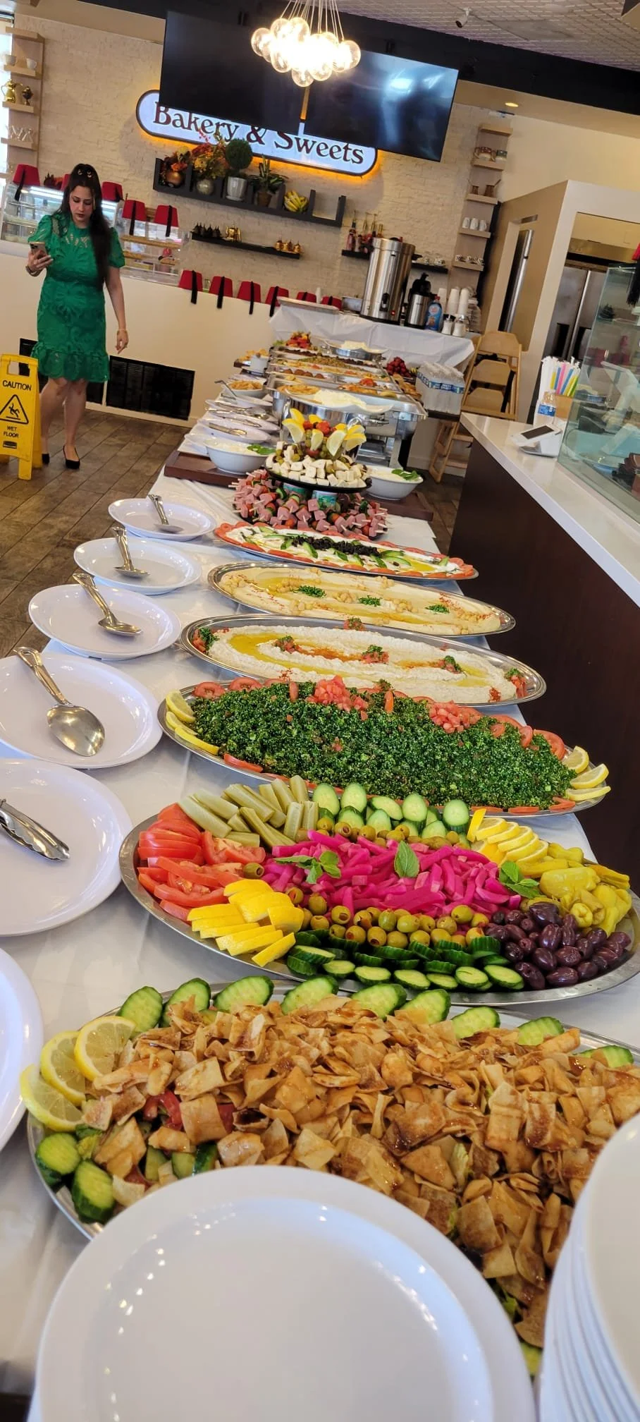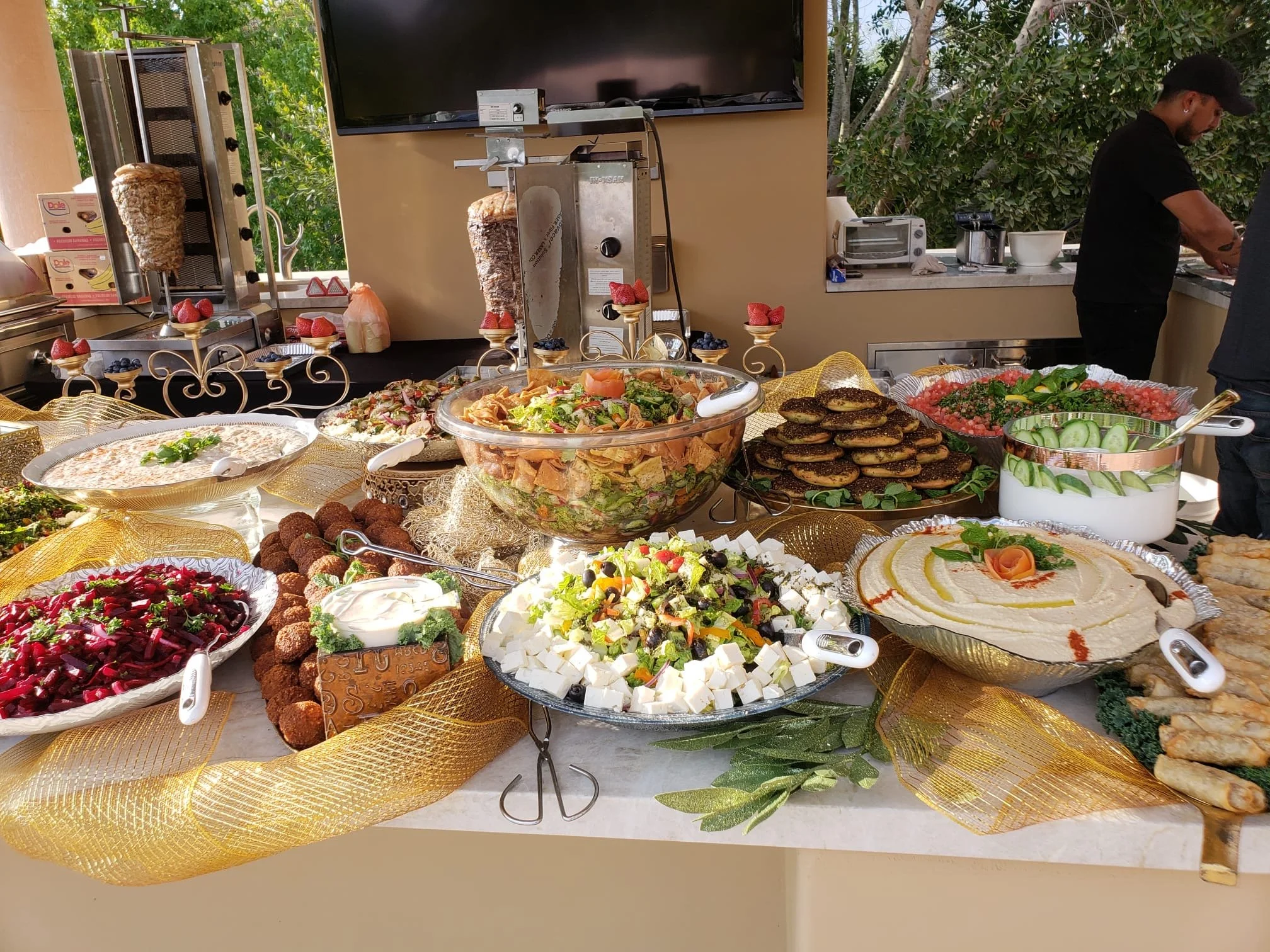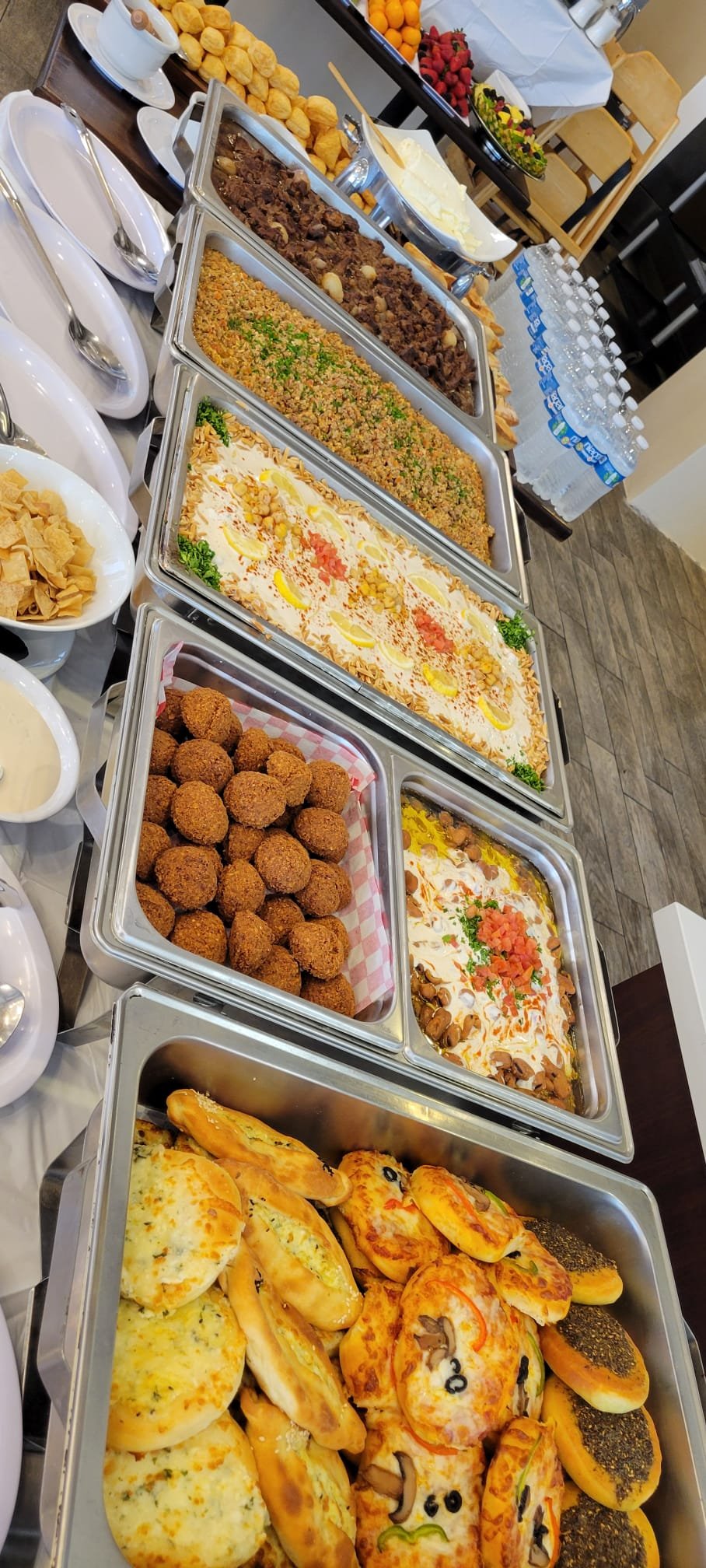 Buffet table with various Middle Eastern dishes, including falafel, rice dishes, salad, meats, bread, and desserts, served in stainless steel trays and white bowls.