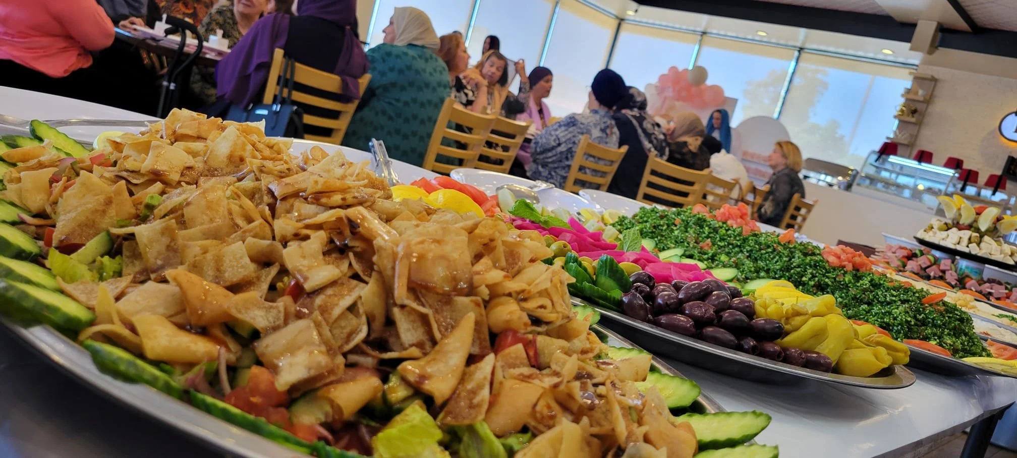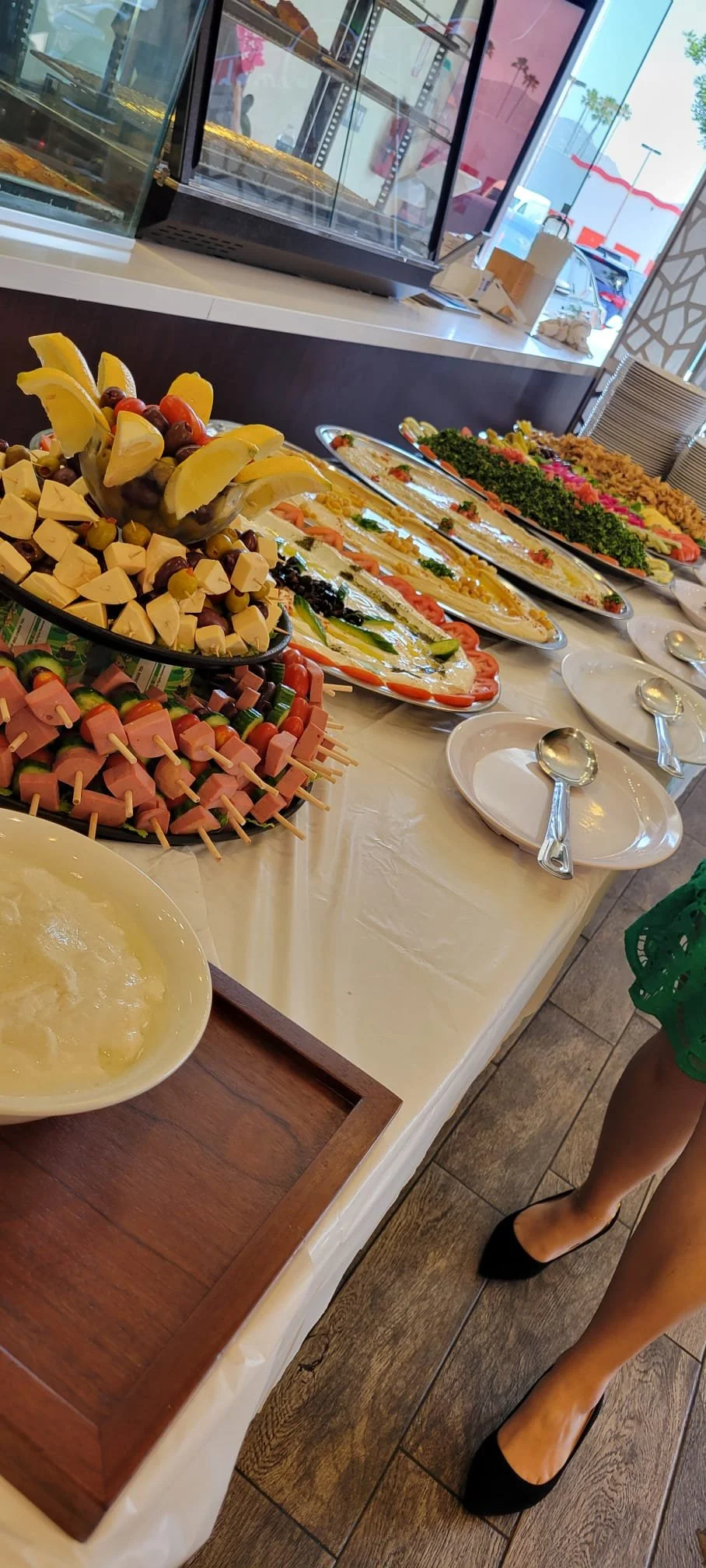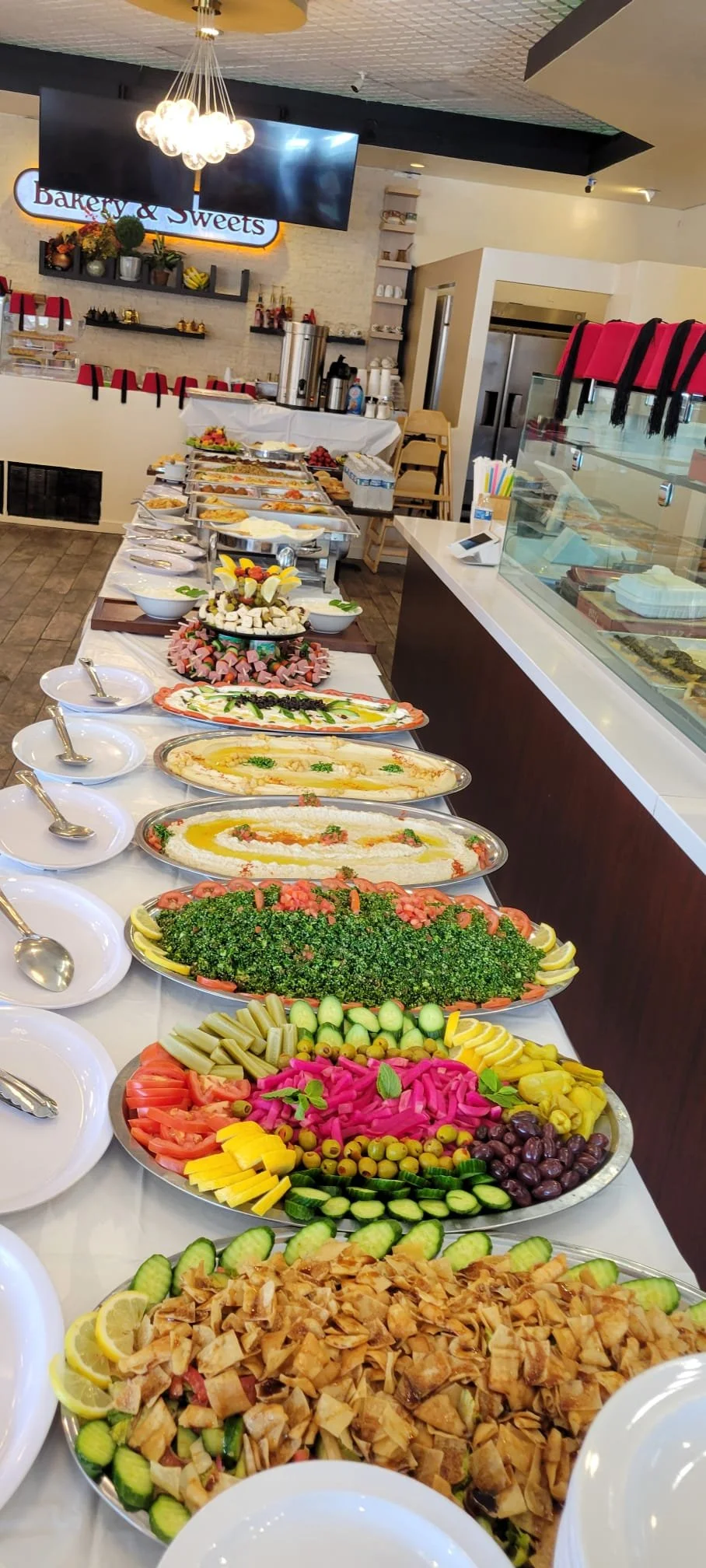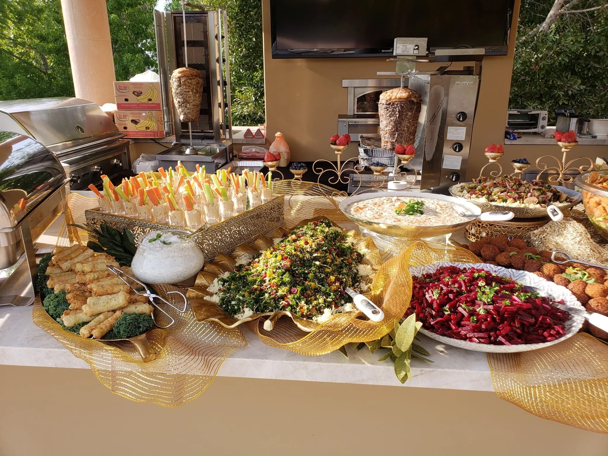 Buffet table with various Middle Eastern dishes, including falafel, rice dishes, salad, meats, bread, and desserts, served in stainless steel trays and white bowls.