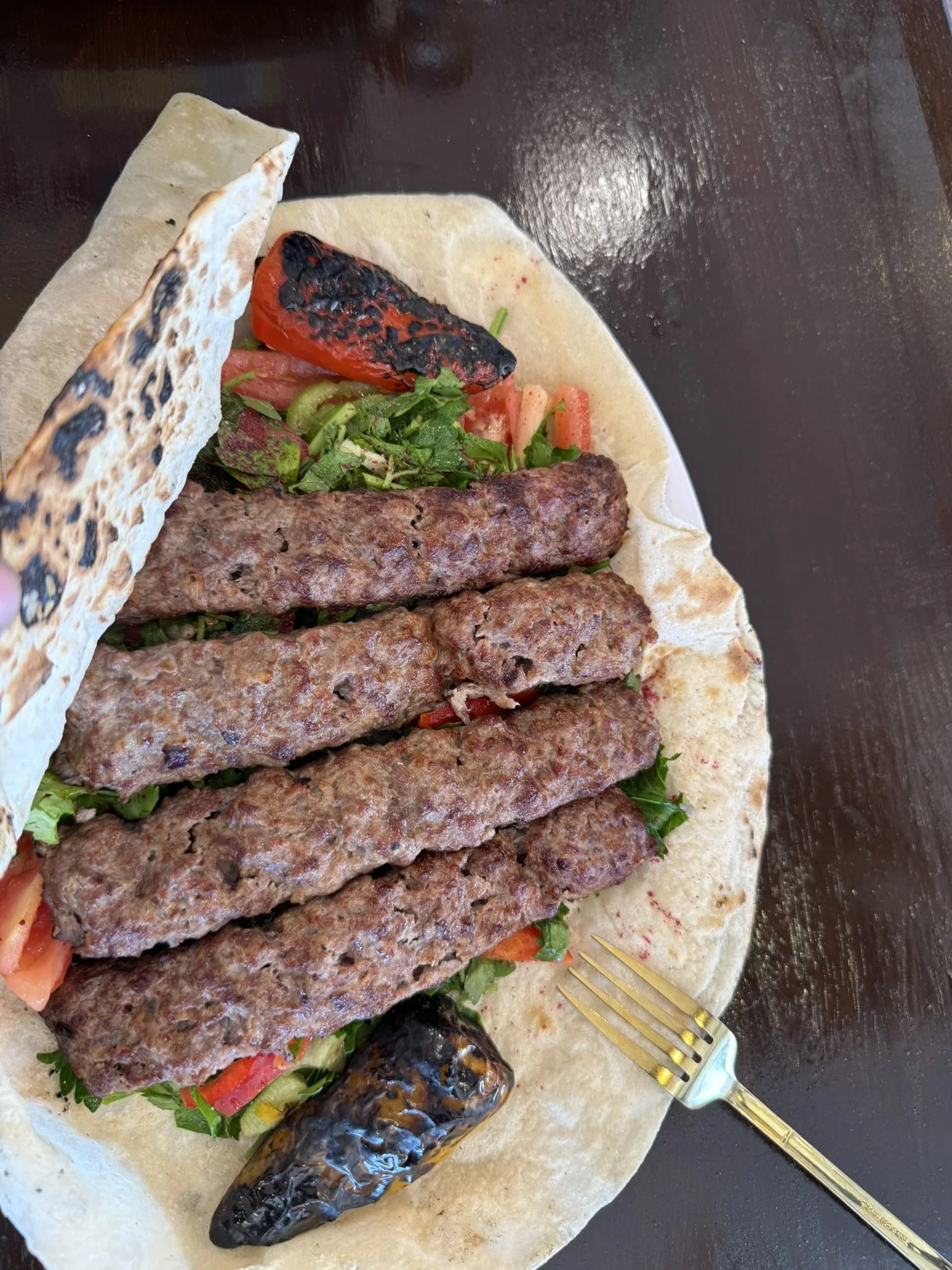 Lamb kebab wrap with grilled vegetables and fresh salad inside a flatbread.