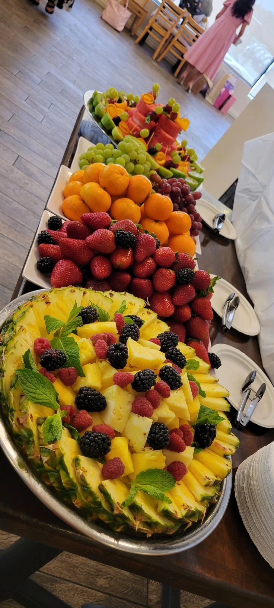 A table with an assortment of fresh fruit including pineapple, strawberries, blackberries, raspberries, grapes, tangerines, watermelon, and various melons, arranged in a decorative display. In the background, there are chairs, a woman in a pink dress
