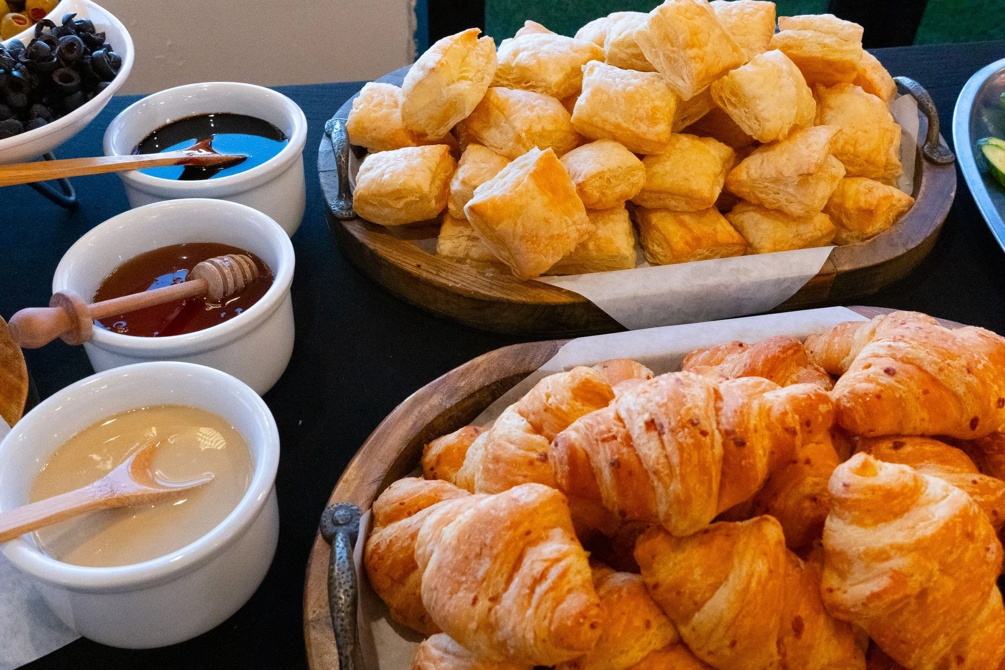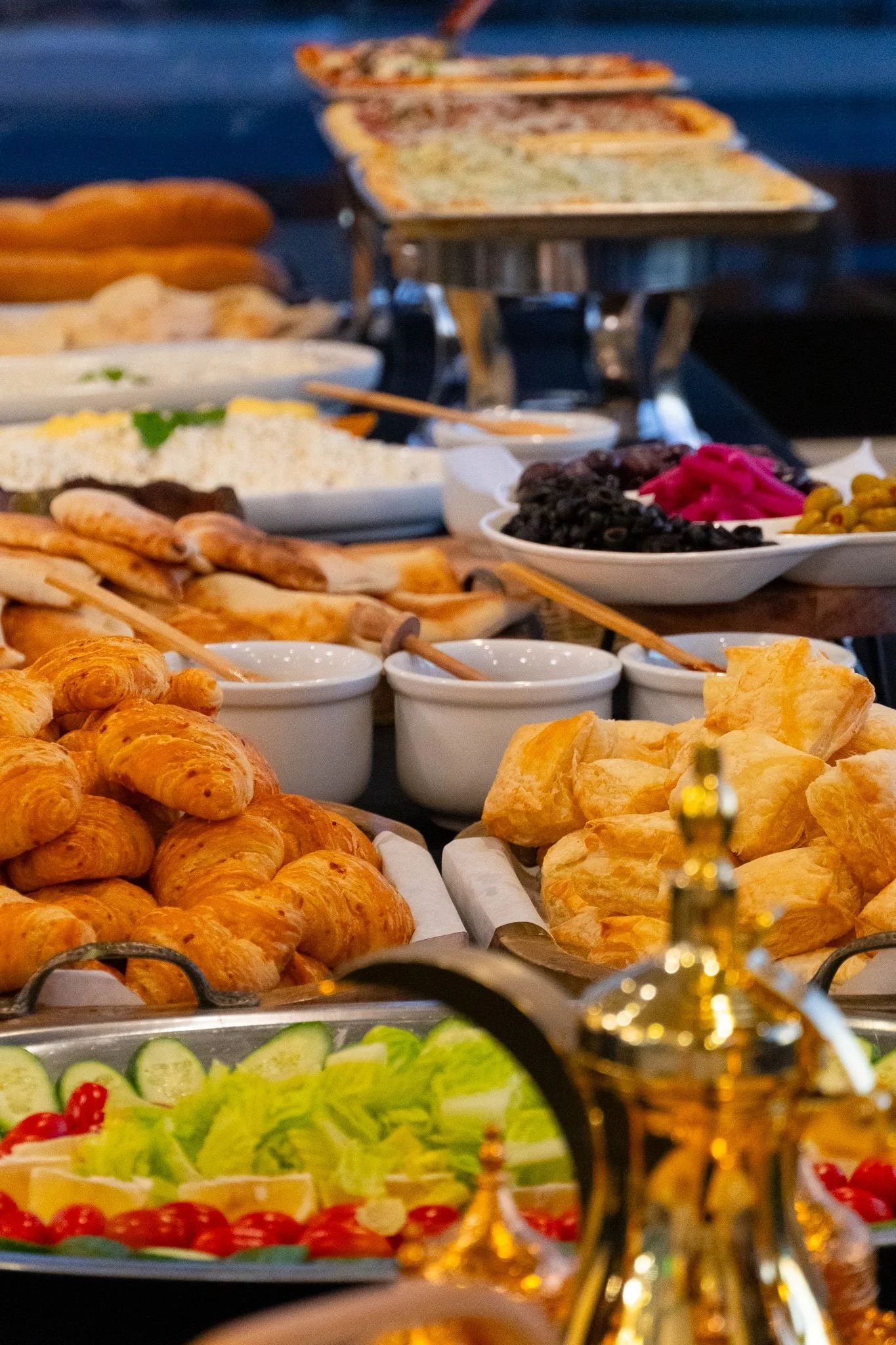 A buffet table with assorted pastries, croissants, bread, fresh vegetables, and side dishes including pickles, olives, and pink pickled onions.