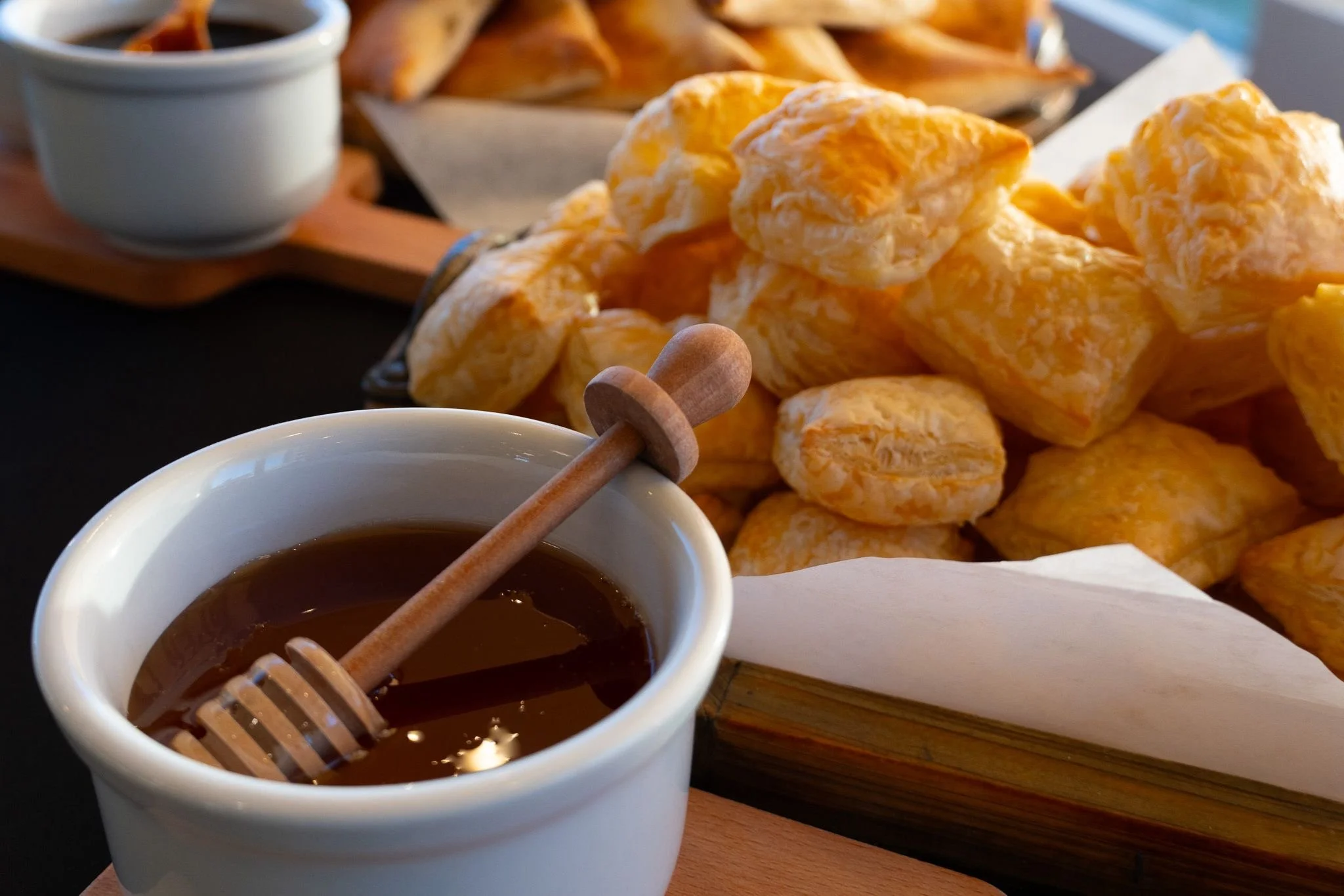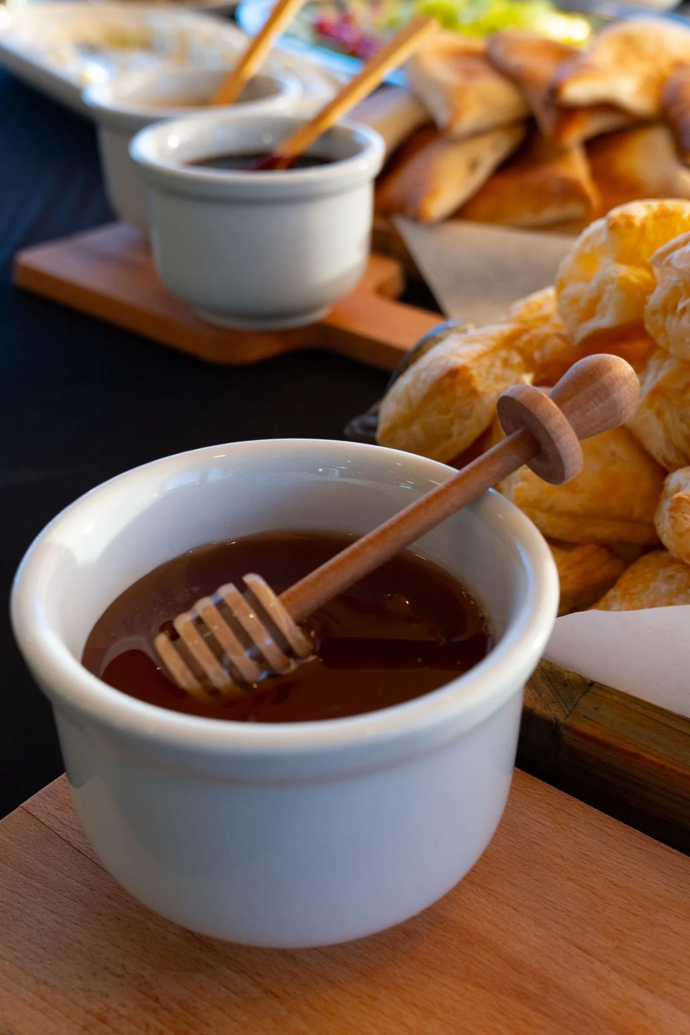 Cup of honey with a honey dipper, bread and pastries in the background on a wooden tray.