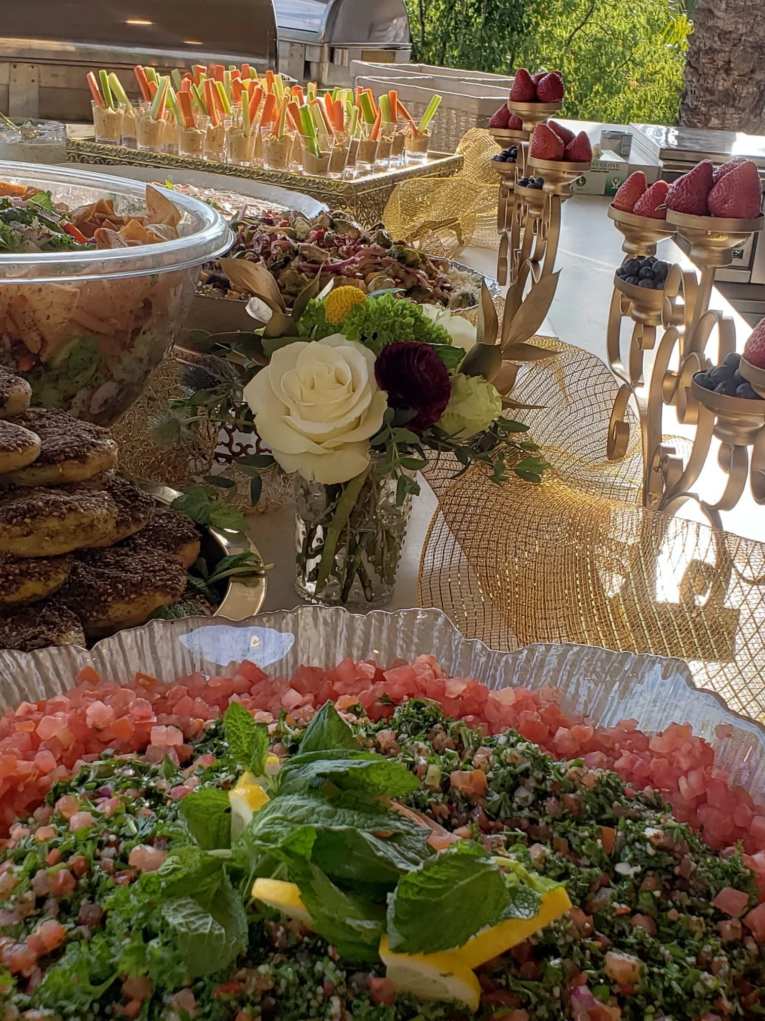 An outdoor buffet table with various salads, appetizers, and finger foods, including vegetable sticks, spring rolls, and beet salad, decorated with gold accents.