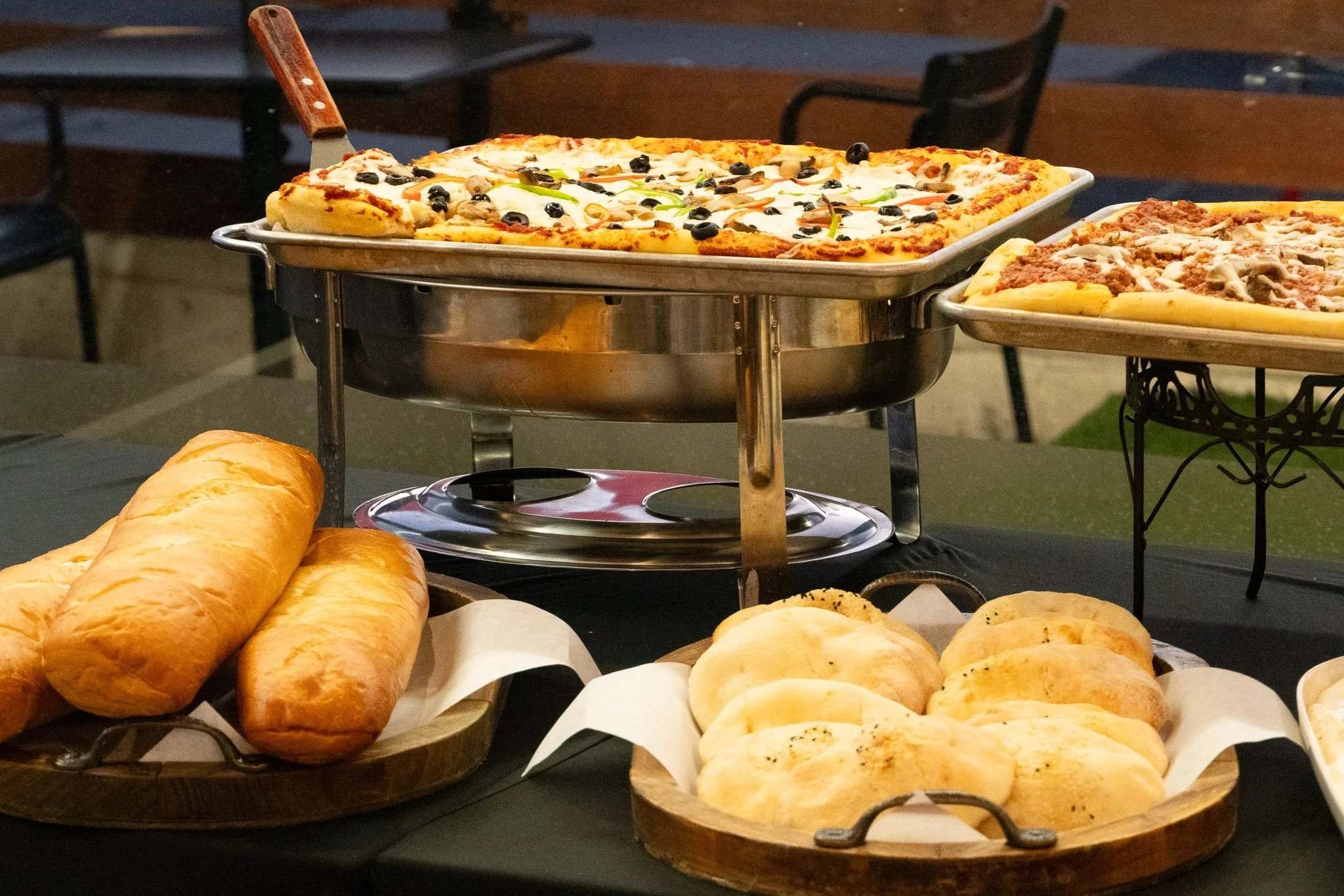 Buffet table with bread rolls, pizza slices, and other dishes in trays.