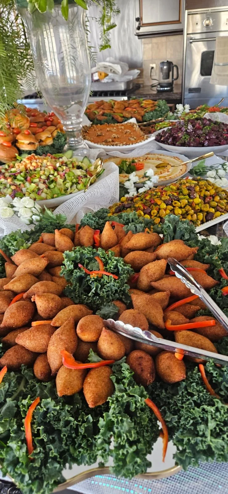 A spread of various dishes on a table, including fried appetizers, salads, and vegetable dishes, with a kitchen in the background.