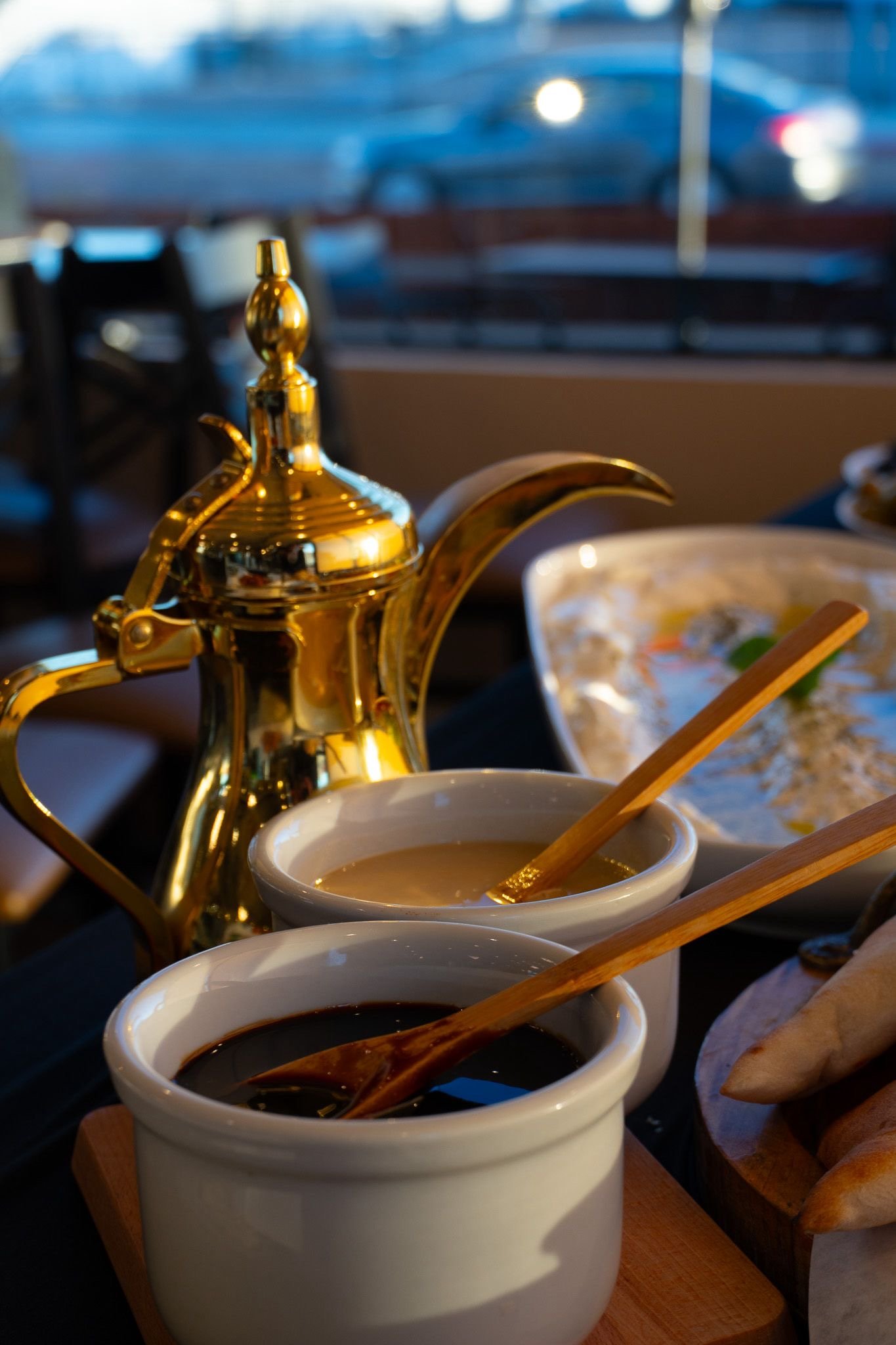 Close-up of two white cups with dark and light sauces and wooden spoons, a golden teapot, and some bread on a wooden tray, with a blurred outdoor scene in the background.
