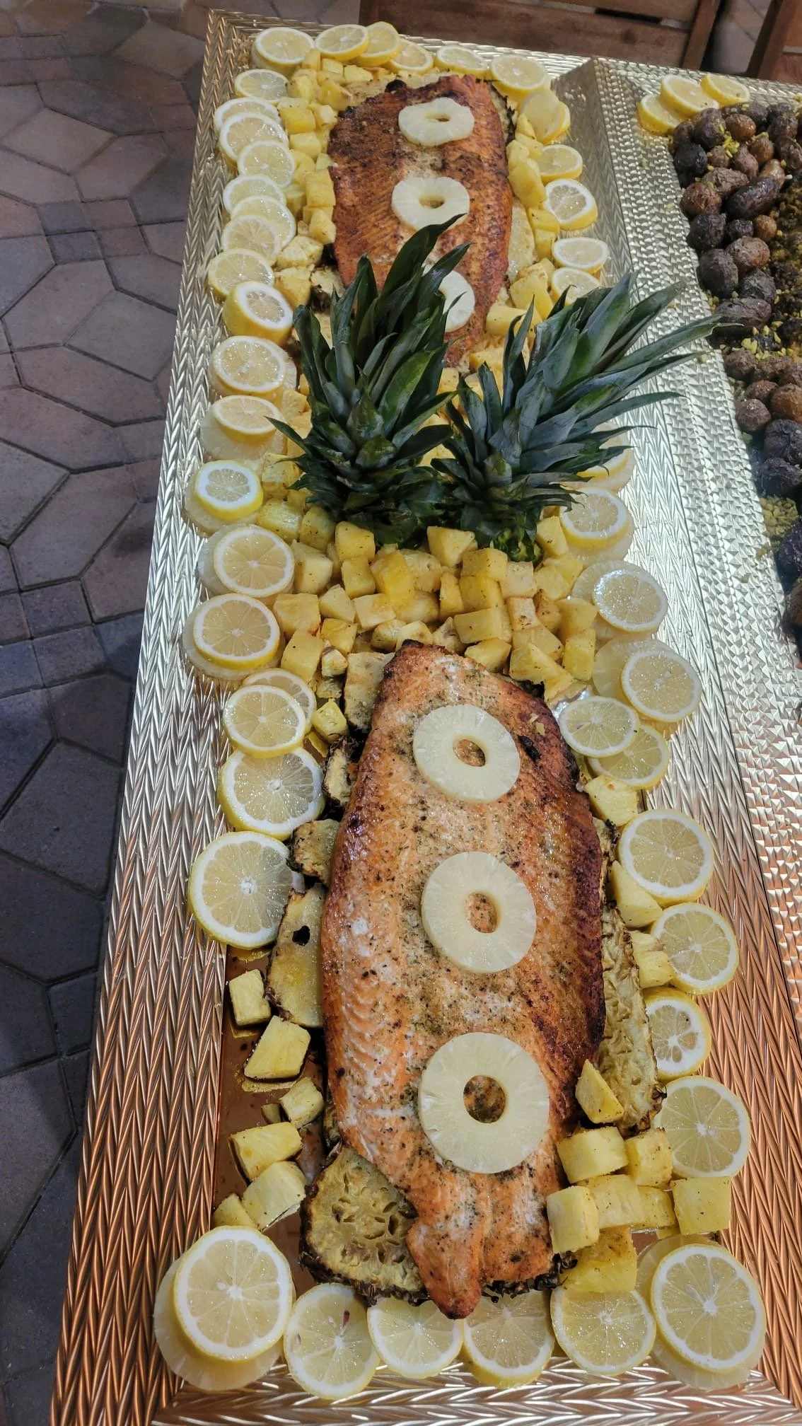 A large serving tray with two pieces of grilled salmon topped with pineapple rings, surrounded by lemon slices, chunks of pineapple, and pineapples with green leaves in the center.