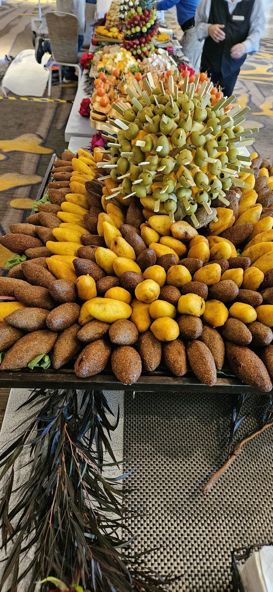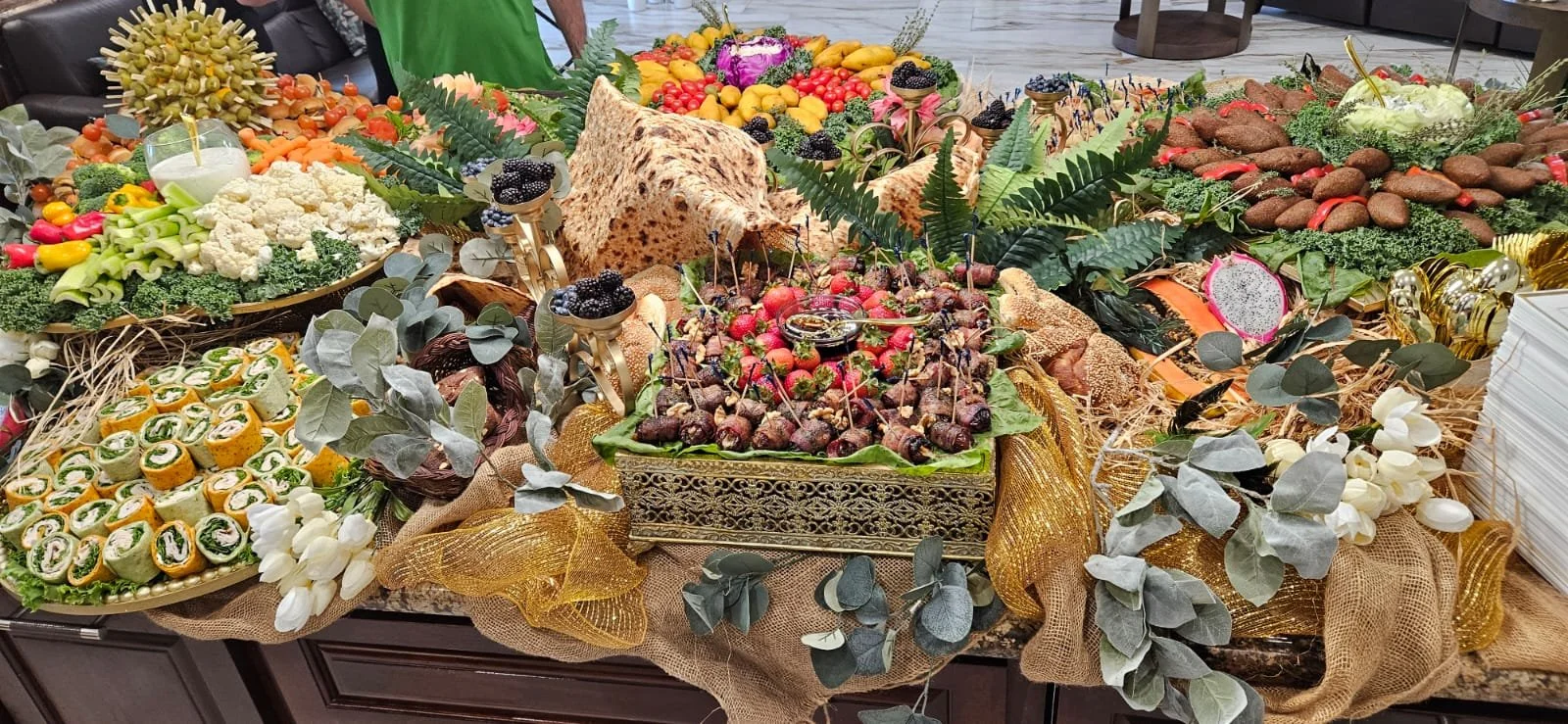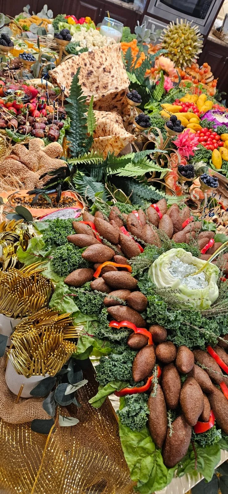 A table filled with an assortment of fresh fruits, vegetables, and appetizers, decorated with green leaves, flowers, and gold accents, likely for a festive occasion or celebration.