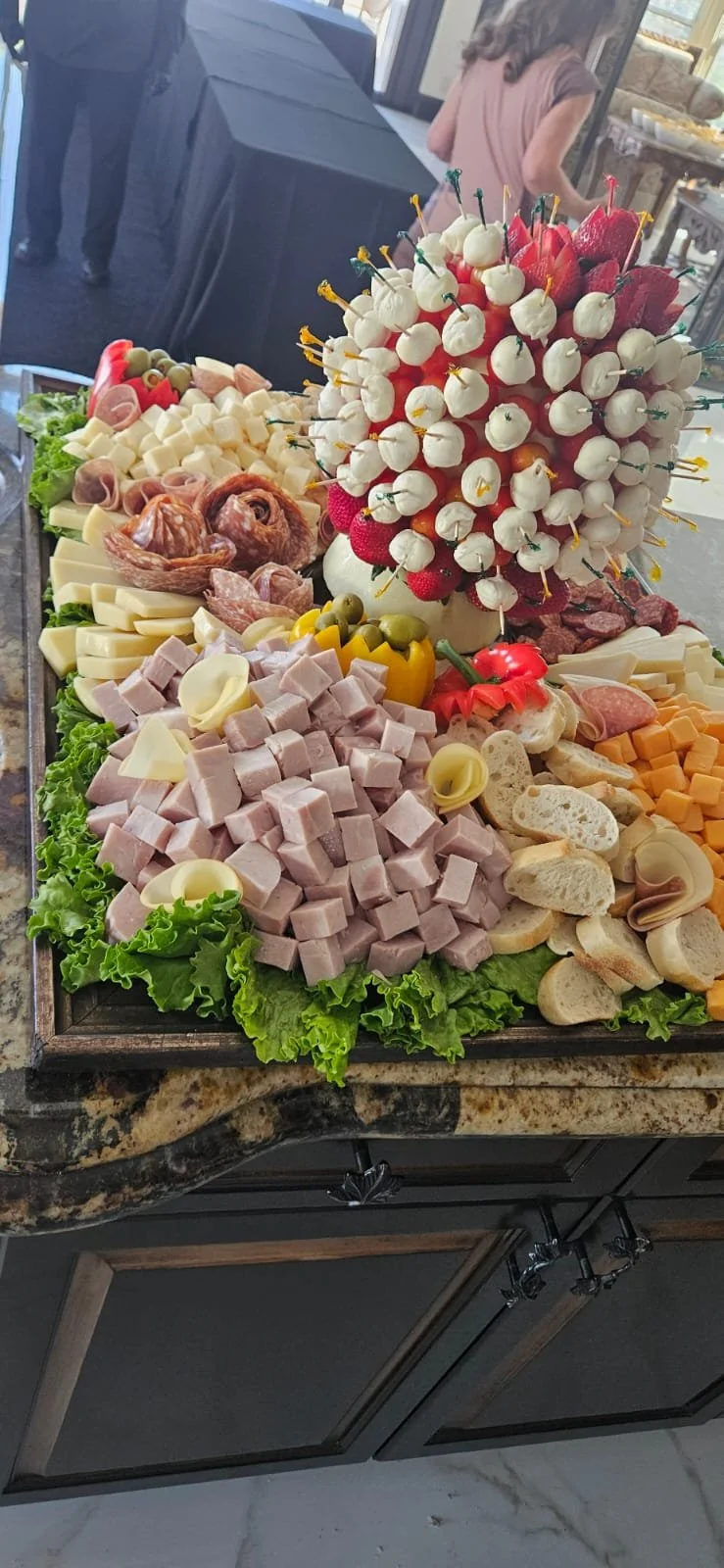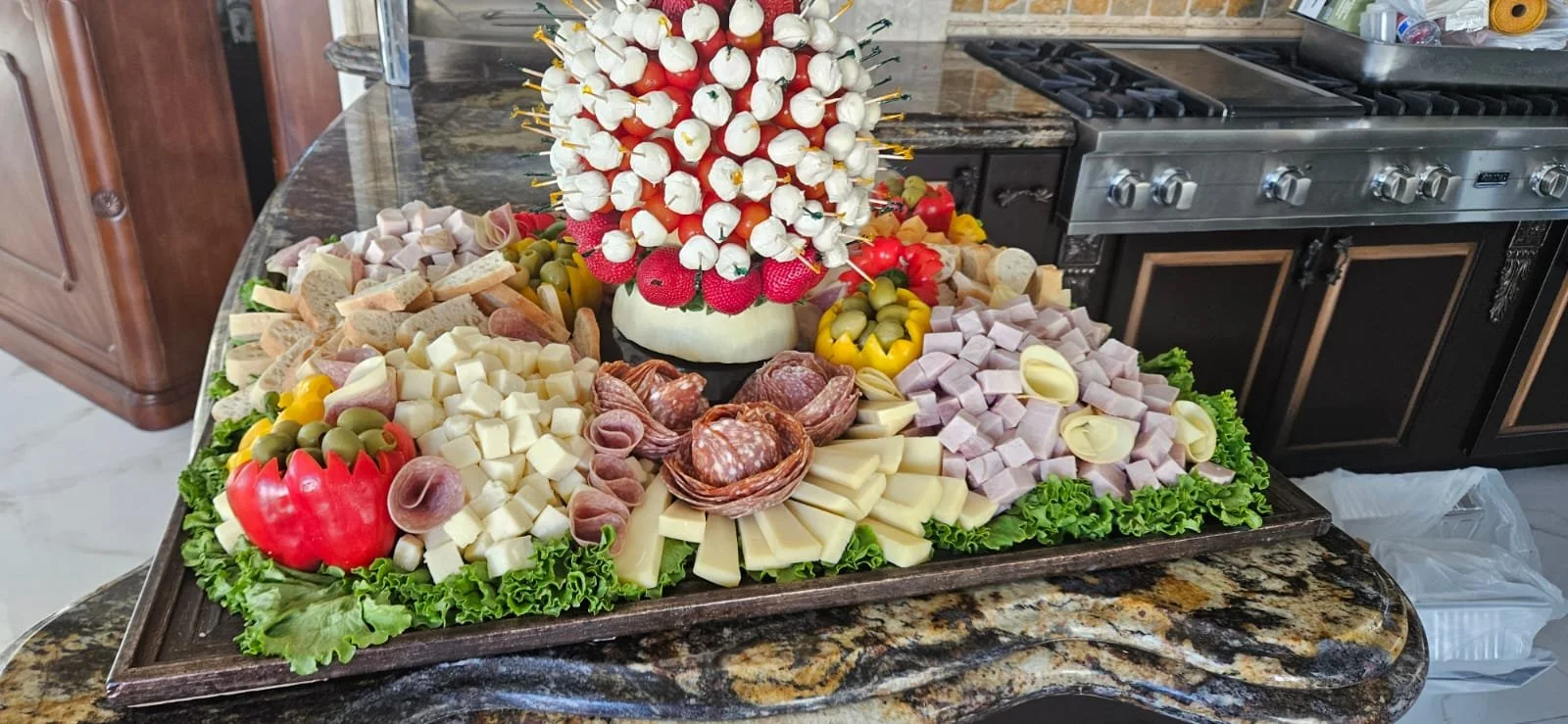 An elaborate charcuterie board on a granite countertop featuring an arrangement of cheeses, cured meats, olives, vegetables, and a decorative centerpiece of skewered mozzarella balls, strawberries, and cherry tomatoes.