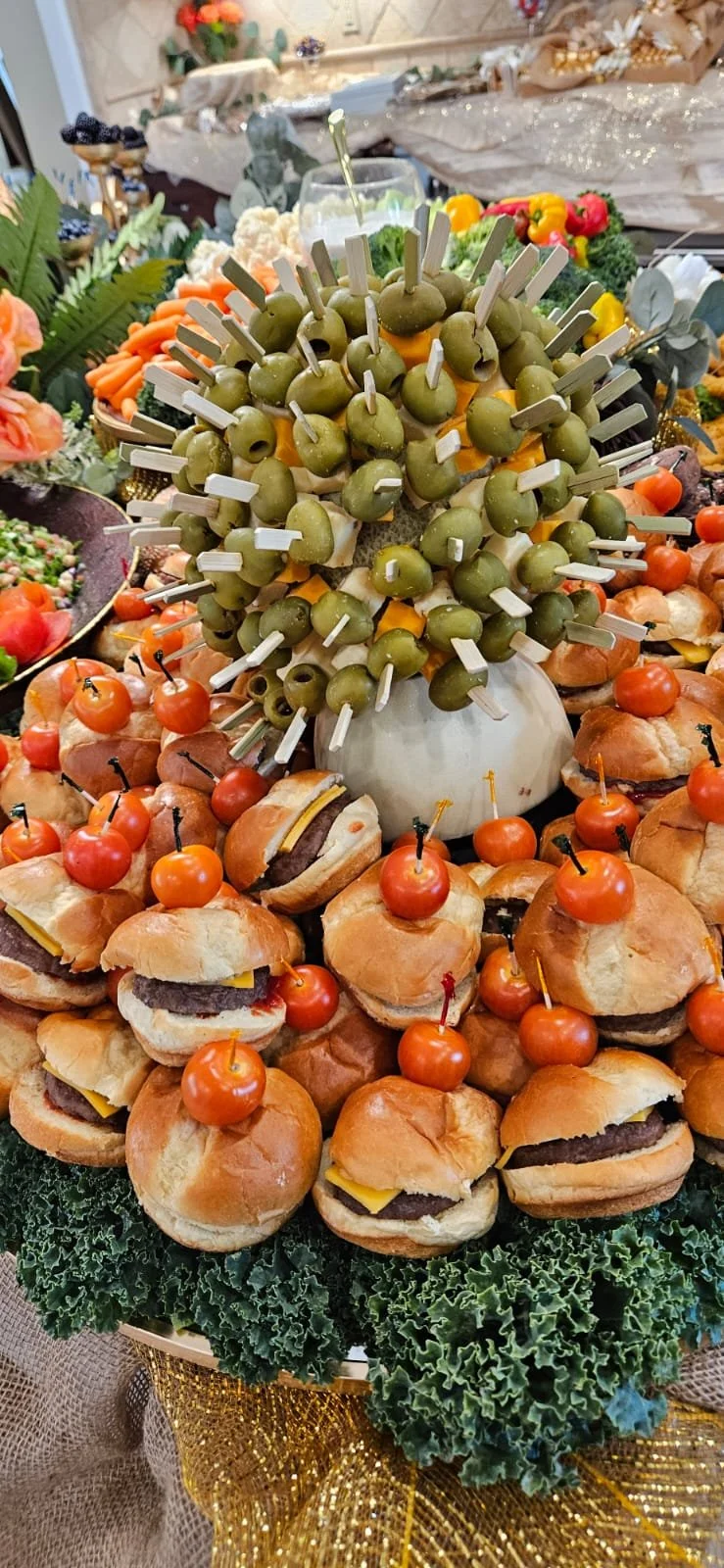 A platter of small sliders with cherry tomatoes on top, surrounded by a decorative leafy green border, and a centerpiece of green olives on toothpicks in the middle.