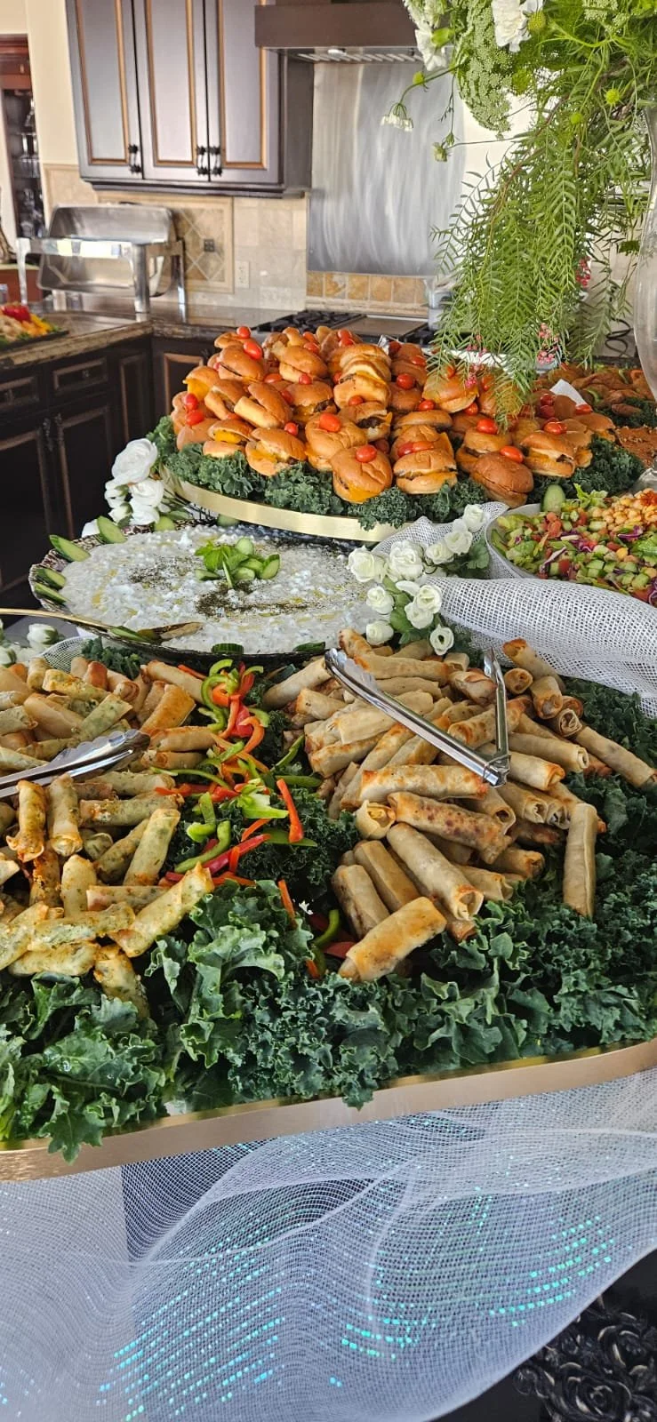 A buffet table with assorted finger foods, including spring rolls, mini sandwiches, and chopped salads, decorated with greenery and white flowers in a kitchen setting.