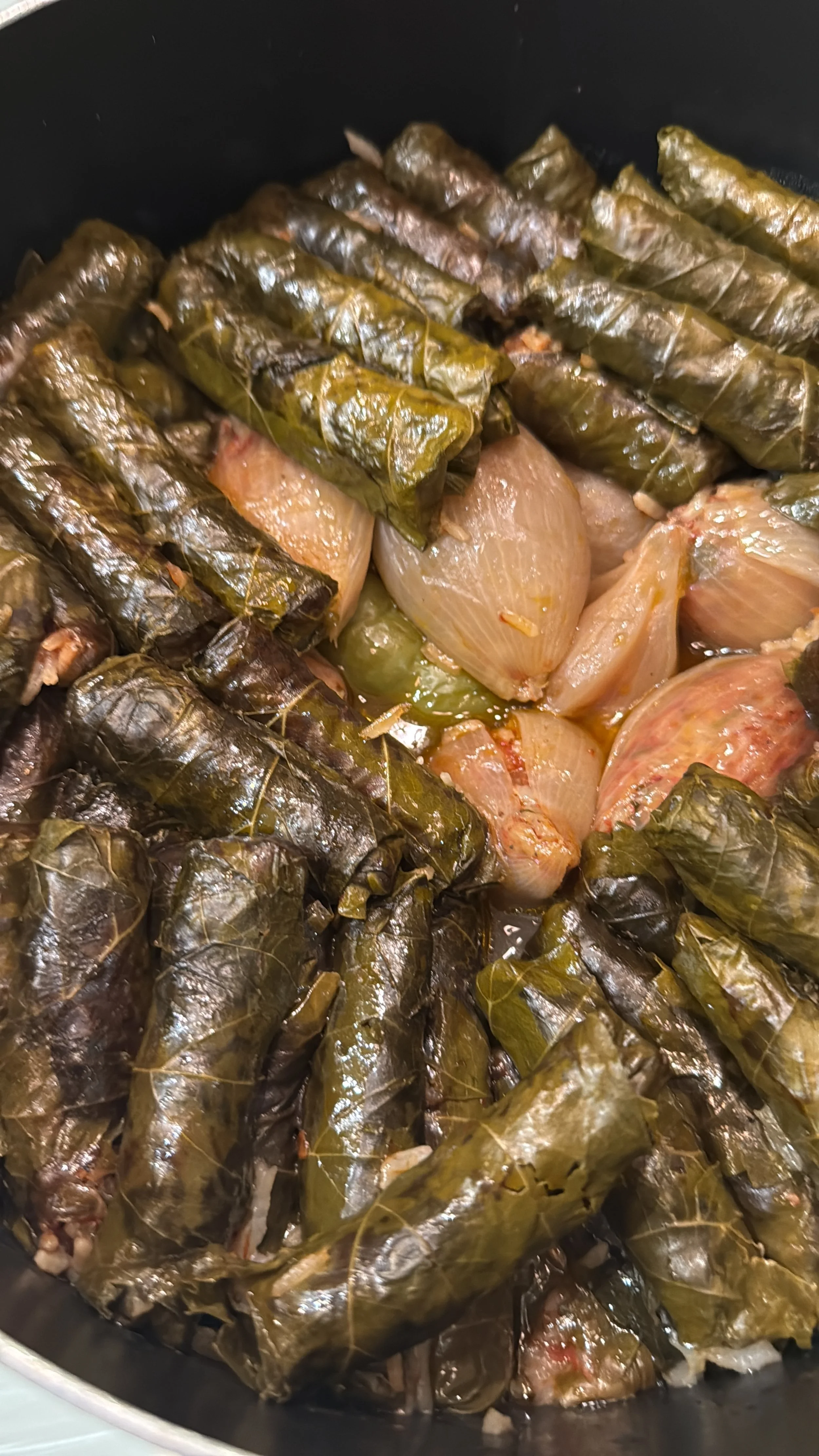 A close-up of cooking stuffed grape leaves (dolmas) in a pot, with some onions and other vegetables visible inside.
