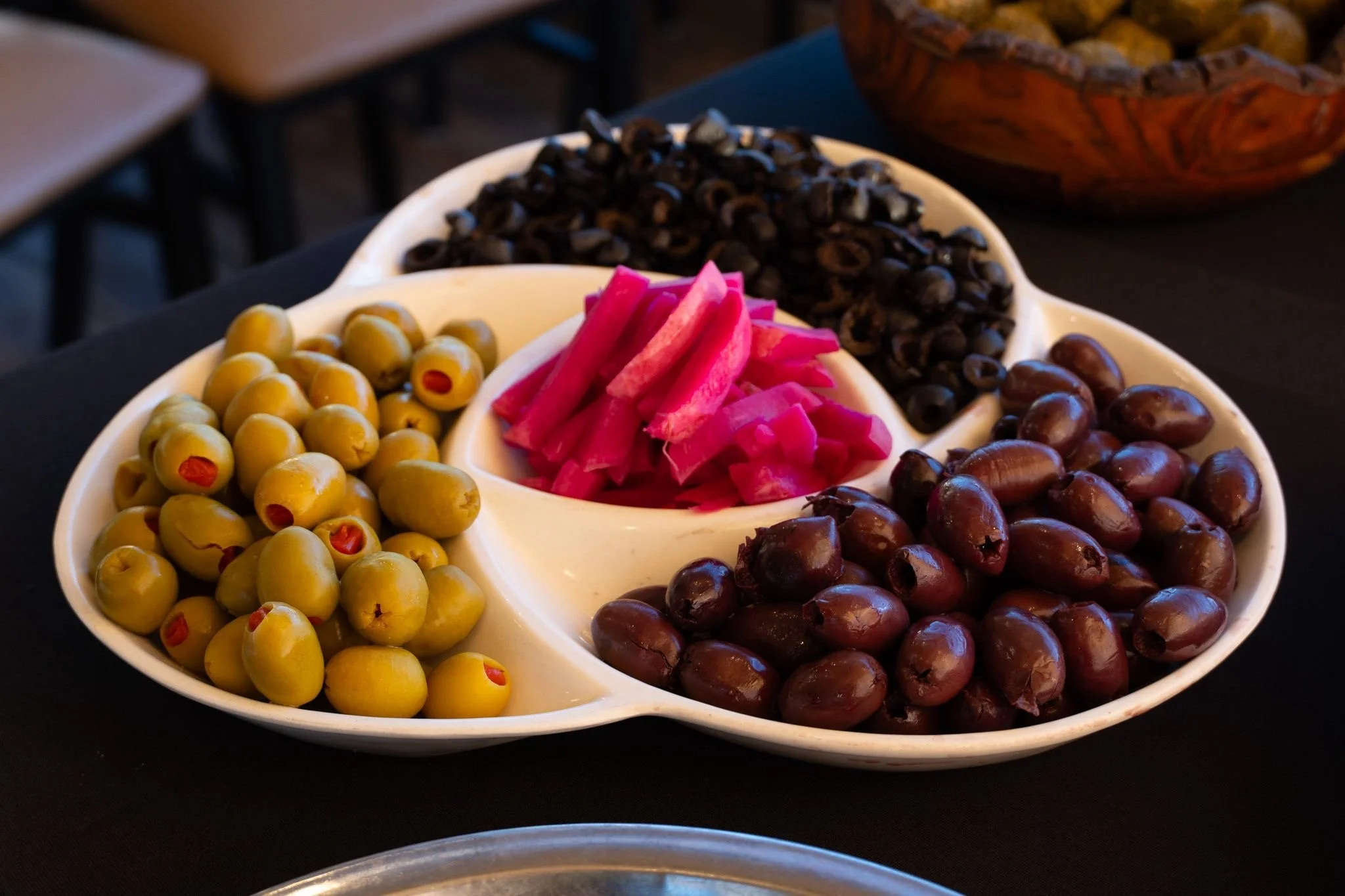 A white serving plate with five sections of various pickled and marinated vegetables, including green olives, black olives, brown olives, chopped pink pickled vegetables, and black pickled mushrooms.