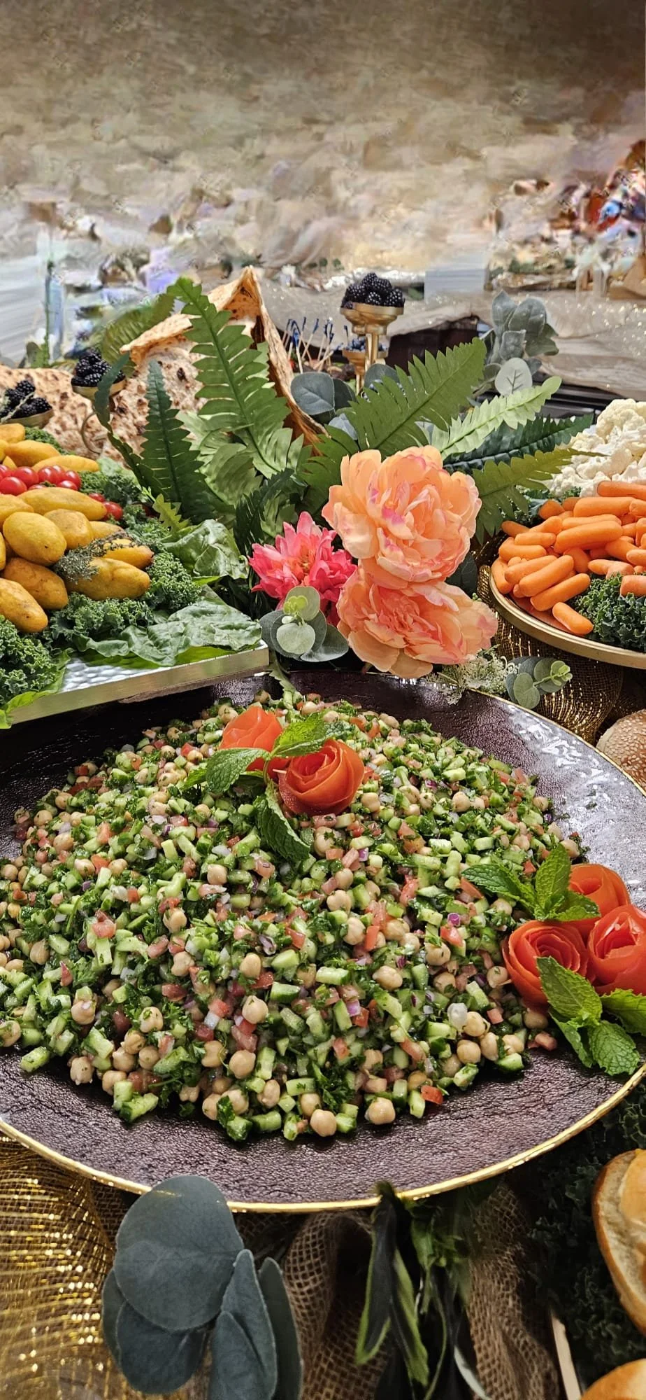 A colorful display of food on a table, featuring a large chickpea salad garnished with orange flowers and menthol leaves, along with a variety of vegetables, cheeses, and crackers, adorned with greenery and pink flowers.