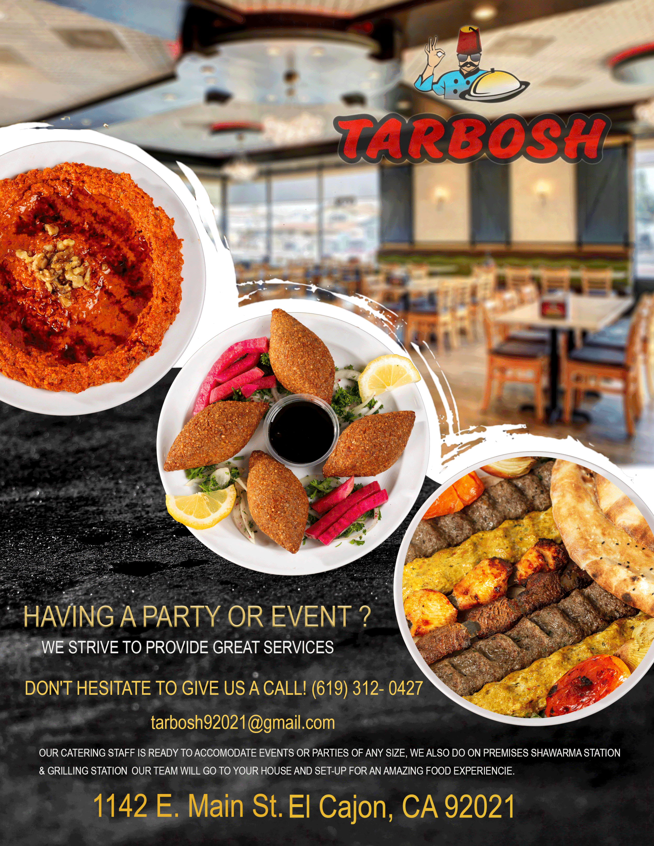Private Events & Catering: For larger parties or catering requests, contact us directly. We can host events up to 140 guests or bring the Tarbosh experience to your location.